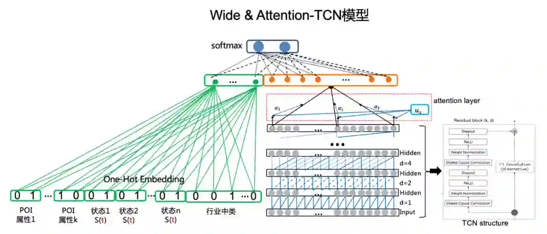 最后将 Attention-TCN 后得到的汇总隐向量和 Wide 部分的隐层进行耦合,得到的 Wide&Attention-TCN 模型结构如图所示。