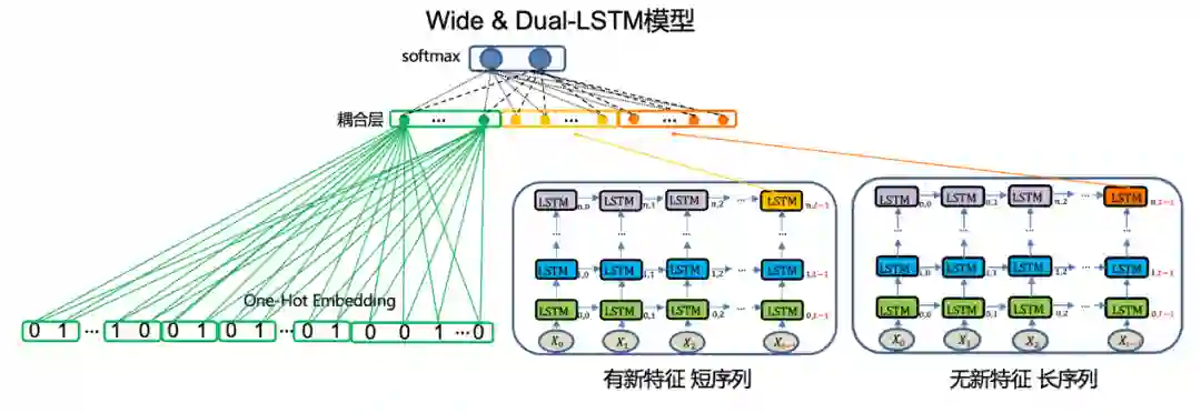由于新特征缺失部分较多且维度较大,缺失值填充的负面影响会过于严重而不适合采用。项目中采用了分而治之的方案,分别建立两个 RNN 模块,其中长 RNN 模块输入无新特征的长序列,短 RNN 模块输入有新特征的短序列,最后将双 RNN 的 Hidden 层和 Wide 部分一起耦合,得到了 Wide & Dual-RNN 模型,结构如图所示。
