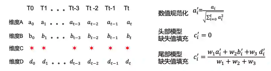 在做模型升级迭代的同时,基础特征的建设工作也在同步进行。在扩充新的趋势特征的时候面临这样一个问题,新特征维数较多且时间序列较短,这样将长时序特征和短时序特征逐时间点匹配时会出现很大部分的数值缺失。