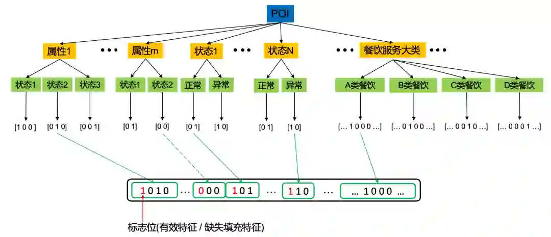 考虑到某些 POI 属性存在缺失的情况,故编码中第1位表示特征是否存在的标志位,后面则为 One-Hot 编码后的对应的属性类型;对于状态特征,同样有一位表示是否特征缺失的标志位,而后面的 One-Hot 编码则表示最新时刻的状态类型;由于不同行业类型有着不同的背景过期率,我们将细分的行业类型做 One-Hot 编码后作为第三种特征。最后将各特征编码依次连接,得到一个高维度的稀疏向量。特征编码的过程如图所示。