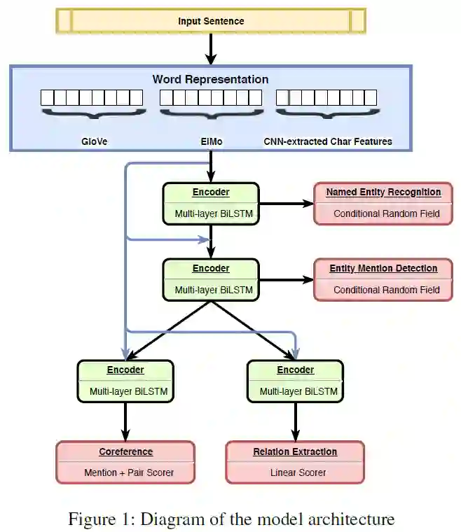 本文研究如何利用多任务学习方法(multi-task learning)来获取更为丰富的语义表征信息,具体的方法是设计一种层次结构的网络模型,用于抽取句子的上下文特征,并依据此特征,依次设计了NER(Named Entity Recognition), EMD(Entity Mention Detection), RE(Relation Extraction), CR(Coreference Resolution)等任务。其中每一个任务都有自己的BiLSTM结构进行训练,并且上层任务同时接收上下文特征、下层语义特征作为输入。训练过程中,一轮更新结束后,会随机选择一个任务以及相应的数据集进行下一轮训练。此外,作者尝试了采用不同的子任务与层次结构进行训练来观察任务组合之间的信息交互。