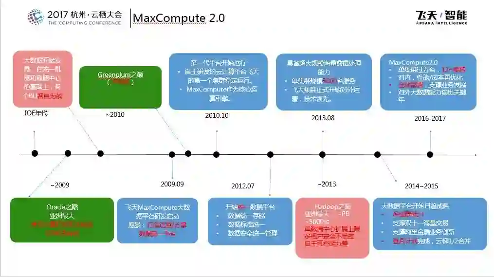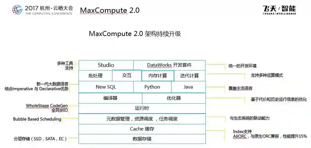 在2016年杭州云栖大会上,阿里巴巴发布了MaxCompute 2.0,那个时候推出了全新的SQL引擎并且提供非结构化处理能力,在2017年MaxCompute做了持续的创新和优化。