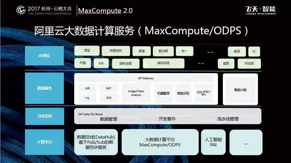 在这之上是开发套件,如Dataworks、MaxCompute Studio,其包括最基本的对数据的管理和认知、对于数据的开发以及对作业的开发和管理。针对于这样的开发和基础平台,向上提供的计算服务包括语音转文本、光学文字识别、机器翻译以及智能大脑这些业务类的产品。在应用层就包括了向淘宝、天猫等比较老牌的淘系产品以及比较新的高德、菜鸟网络以及合一集团等提供所有的技术服务,以上就是MaxCompute平台对内和对外的整体布局。