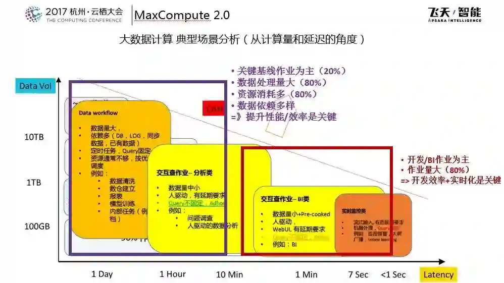 交互分析的数据量处于中小级别,有一定的延迟要求。所以这样不同任务对应的不同的技术优化方案,Data Workflow就偏向pipeline型的作业,提升运行性能和效率是关键,对于以开发类和BI类的作业为主的,作业量比较大占大头,但是整体资源占用率比较低,对于这种类型开发效率和时序化是关键。今年在MaxCompute大数据平台的发展上,除了继续提升整体系统效率以外,时序化和开发效率也是今年的重点。