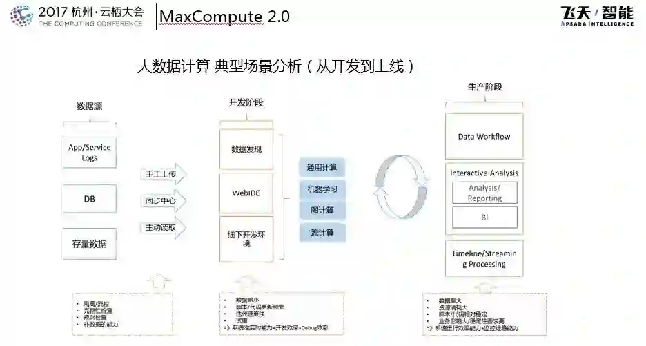 而系统也需要对于开发阶段提供必要的支持,因为开发阶段通常是小数据量的,代码和脚本的更新速度比较快,可能经常处于试错的过程,所以需要系统具备准实时的能力、开发效率和Debug效率,这实际上是对人提出的要求。当进入到生产阶段的时候,通常情况下作业相对比较固定,资源和数据量消耗大,对于稳定性的要求就比较高,系统需要提供系统级别的优化能力以及运算能力。以上就是站在阿里巴巴的角度看的从开发到上线的大数据典型场景的分析。