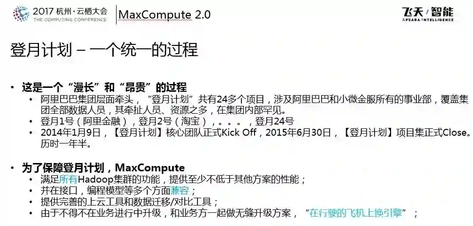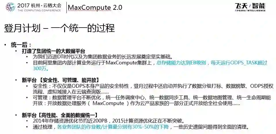 打造了集团统一的大数据平台。“登月计划”将阿里巴巴内部所有的机器资源、数据资源统一到了一起。因为数据具备“1+1>2”的特性,所有的数据贯通之后,集群整体的利用效率、员工的工作效率以及数据流转等方面就变得非常高效的。到目前阿里集团内部计算业务运行于MaxCompute集群上,总存储能力达到EB级别,每天运行ODPS_TASK超过几百万。