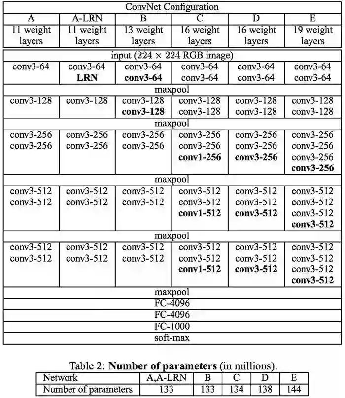 从下图我们可以看出来,VGG 使用多个 3x3 卷积来对高维特征进行提取。因为如果使用较大的卷积核,参数就会大量地增加、运算时间也会成倍的提升。例如 3x3 的卷积核只有 9 个权值参数,使用 7*7 的卷积核权值参数就会增加到 49 个。因为缺乏一个模型去对大量的参数进行归一化、约减,或者说是限制大规模的参数出现,因此训练核数更大的卷积网络就变得非常困难了。