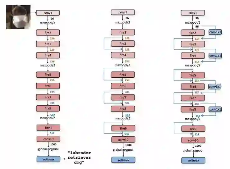2016 年 11 月才发表的文章,一看论文的标题可以被镇住:SqueezeNet: AlexNet-level accuracy with 50x fewer parameters and < 0.5MB model size。文章直接说 SqueezeNet 有着跟 AlexNet 一样的精度,但是参数却比 Alex 少了接近 50 倍并且参数只需要占用很小的内存空间。这里的设计就没有 SegNet 或者 GoogleNet 那样的设计架构惊艳了,但 SqueezeNet 却是能够保证同样的精度下使用更少的参数。