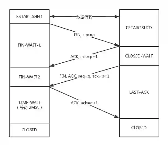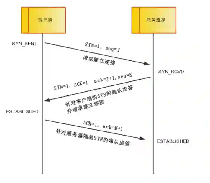 客户端收到后,发送ack,seq=x+1,ack=y+1给服务器端,状态变为established,服务器收到后,状态变成established。
