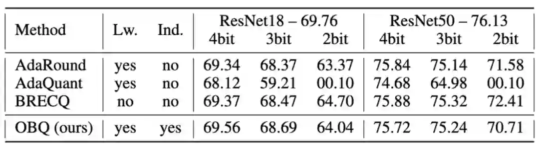 表 3 对比了 OBQ 与其他最先进的训练后量化方法的性能结果。从中可以看出,尽管 OBQ 独立优化了每个层,但在性能表现上与其他联合优化的方法相比非常相近。