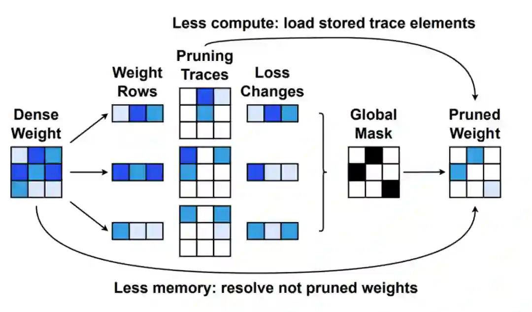 如果有足够的 CPU 内存可用的话,我们还可以保留每行的修剪轨迹,即每个单独修剪步骤之后的完整权重矩阵,这是一种用空间换时间的权衡,在额