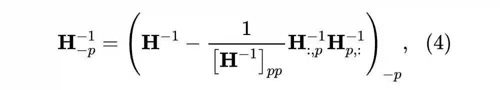 本文提出了一种基于高斯消元法的等价求解方法,来根据当前海森矩阵的逆快速计算下一步迭代时新的海森矩阵逆。当我们去除某一个权重时,海森矩阵对应行列的元素也将删除,基于这一事实,在更新逆时我们可以直接使用高斯消元法将对于行列的元素去除,具体公式如下: