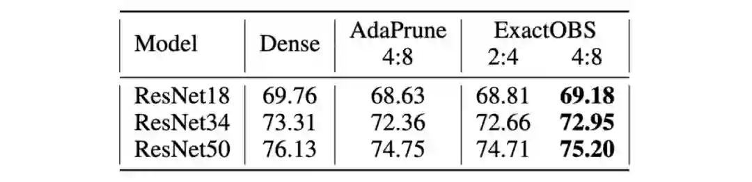 表 1 展示了不同 FLOP 的非结构化剪枝结果。在 ResNet、YOLOv5 和 BERT 上,本文提出的 ExactOBS 算法的表现通常是最好的,尤其是在大稀疏率的情况下。