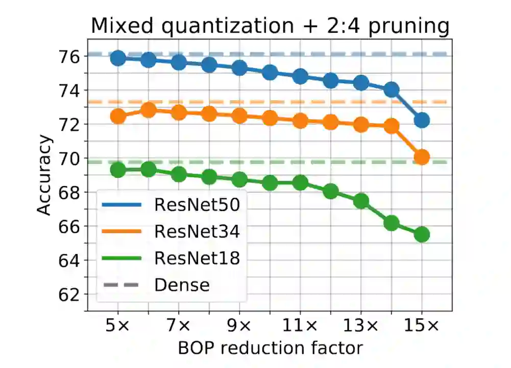 图 3 展示了OBC 将剪枝和量化结合起来的性能效果。在相对性能下降约 2.5% 的代价下,ResNets 的 BOP(比特数乘以 FLOPs)降低了 12~14 倍。