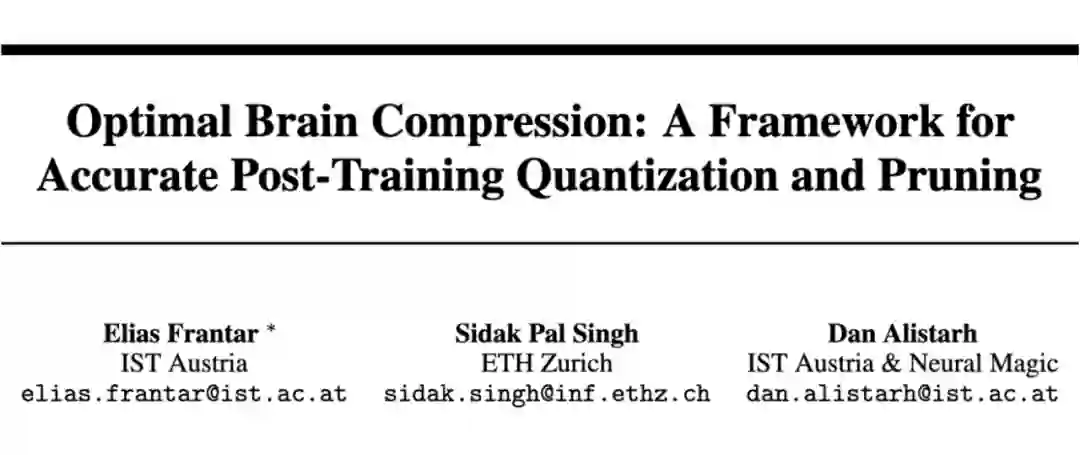 新的训练后压缩框架 Optimal Brain Compression(OBC),该框架在统一范式下涵盖了权重剪枝和量化 。