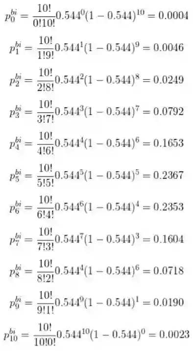 二项分布——n=10、p=0.544,k 取值在 0 到 10 之间。