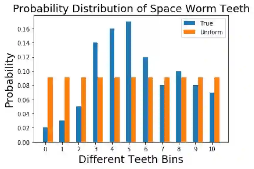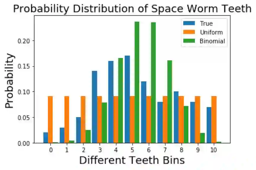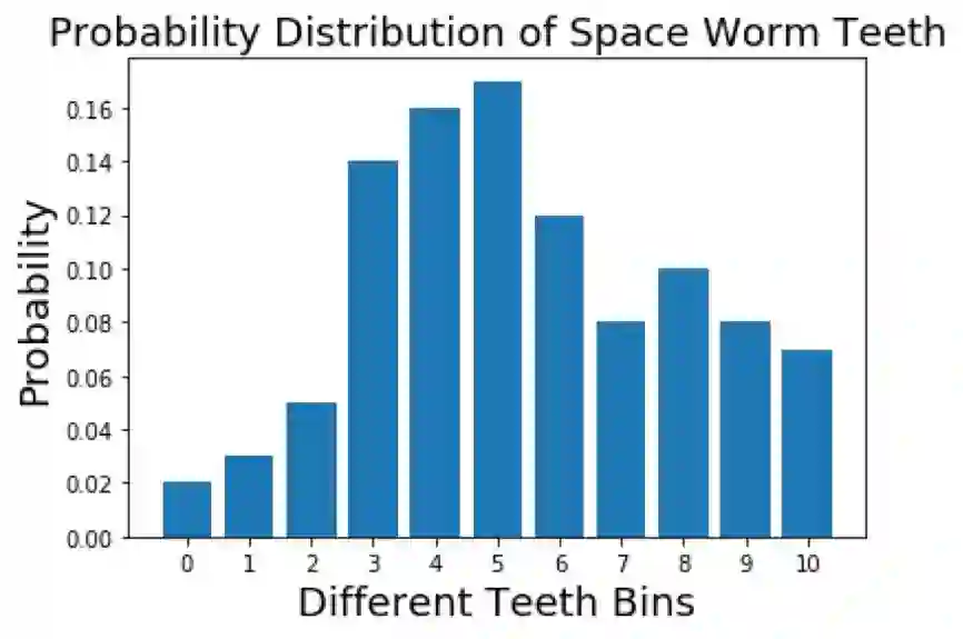 上述博文中所解决的核心问题是这样的:假设我们是一组正在广袤无垠的太空中进行研究的科学家。我们发现了一些太空蠕虫,这些太空蠕虫的牙齿数量各不相同。现在我们需要将这些信息发回地球。但从太空向地球发送信息的成本很高,所以我们需要用尽量少的数据表达这些信息。我们有个好方法:我们不发送单个数值,而是绘制一张图表,其中 X 轴表示所观察到的不同牙齿数量(0,1,2…),Y 轴是看到的太空蠕虫具有 x 颗牙齿的概率(即具有 x 颗牙齿的蠕虫数量/蠕虫总数量)。这样,我们就将观察结果转换成了分布。