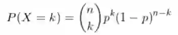 你可能计算过抛硬币正面或背面向上的概率,这就是一种二项分布概率。我们可以将同样的概念延展到我们的问题上。对于有两个可能输出的硬币,我们假设硬币正面向上的概率为 p,并且进行了 n 次尝试,那么其中成功 k 次的概率为: