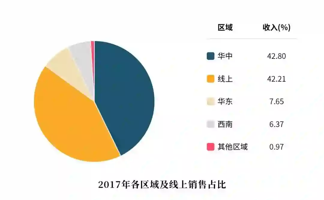 比如加盟,良品铺子提供商标、商品、管理、营运和人员等,加盟商负责物业和资金投入。2017年数据显示,华中地区仍是业务重点区域,收入占比为42.80%,其次是华东和西南,收入占比分别为7.65%和6.37%。