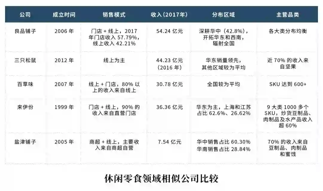 在休闲零食行业,许多品牌以单品取胜。比如三只松鼠,坚果销售收入占比近70%、毛利占比65%。良品铺子各品类均衡发展,爆款单品包括猪肉脯、脆冬枣、鸡蛋干、芒果干、甜辣鸭舌等。