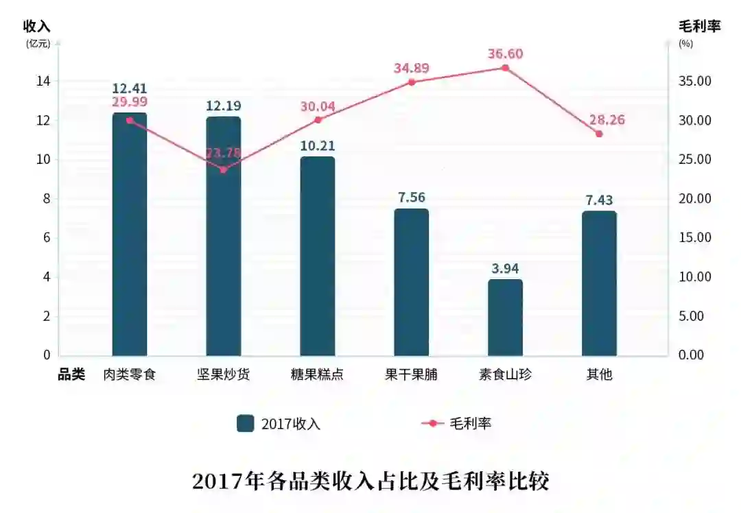2017年线上渠道毛利率为25.63%,连续三年上升,但因起步时间较晚,低价促销抢占市场,毛利低于线上起家的三只松鼠。