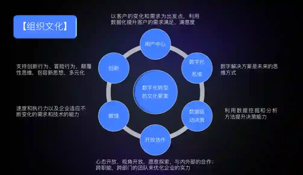 然后我们看看组织文化。这张图展示了企业要做数字化转型,一定要具备的文化要素包括: