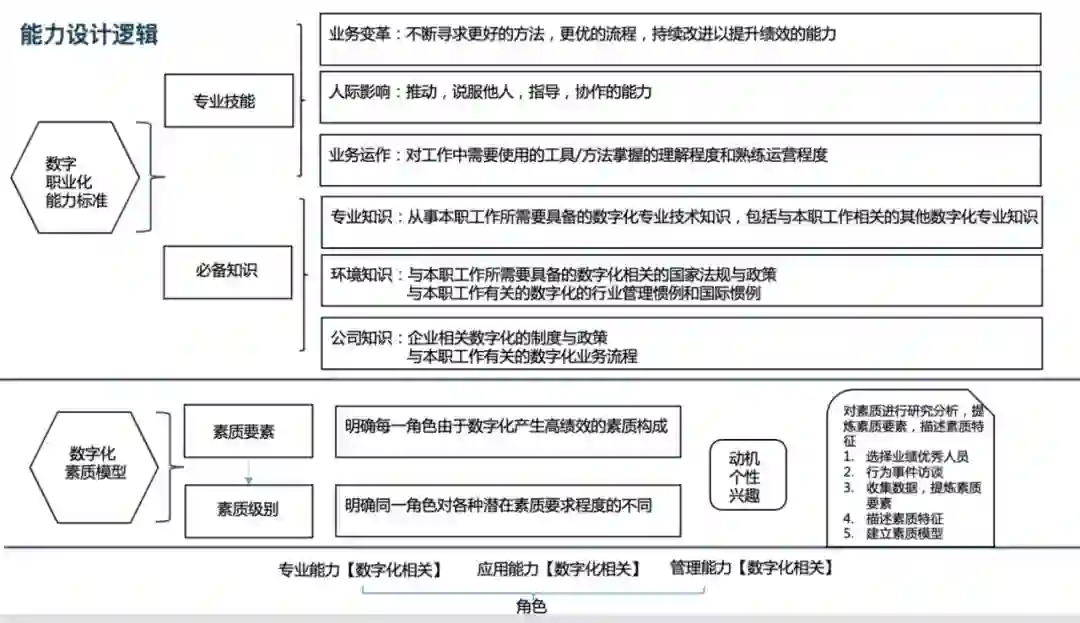 第二点关键是数字化人才标准制定。这是一个样例,是在数字化人才标准的能力设计逻辑下的能力标准和素质模型。