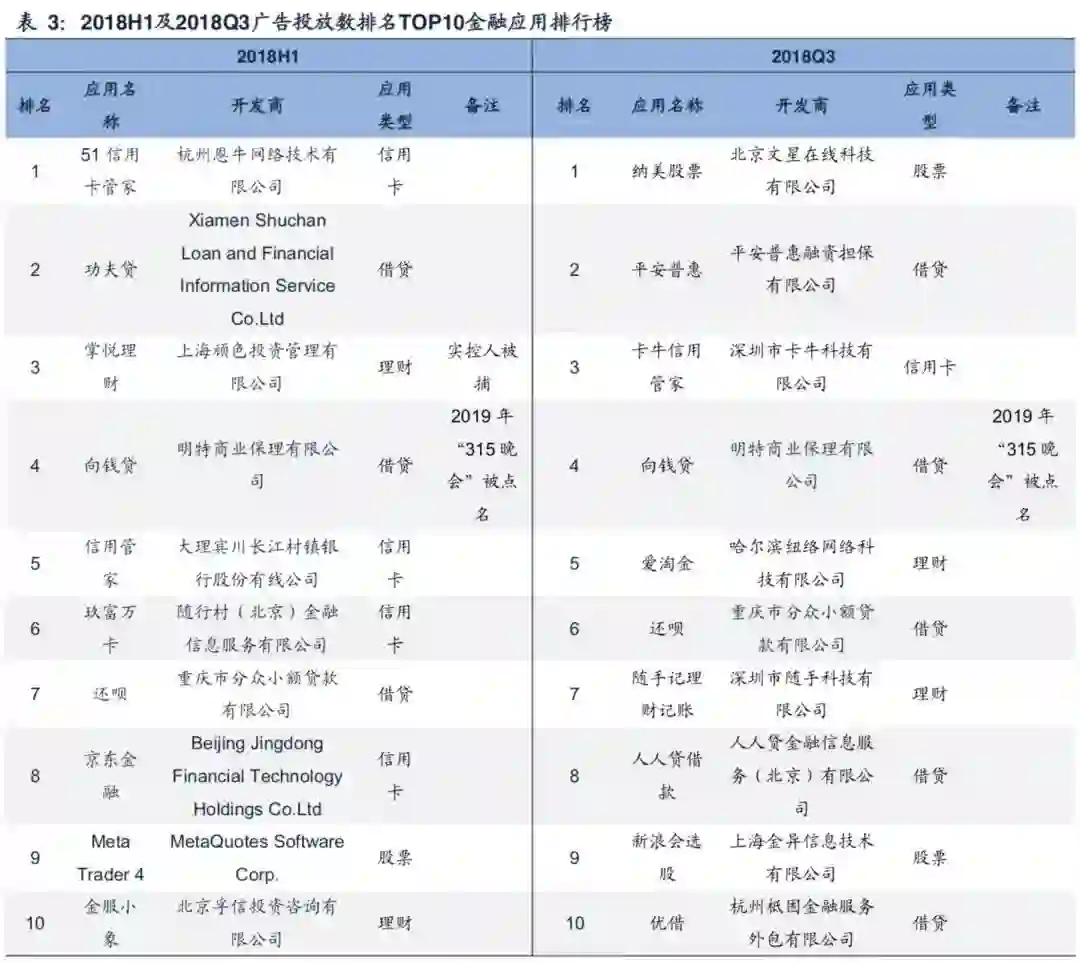 监管的收紧和新金融行业的风险暴露可能是最直接的原因。广发证券此前发布的一份报告显示,截至目前,2018年上半年报告中披露的广告投放数排名前十的金融应用中已有两家机构出现问题。
