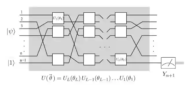 使用量子神经网络执行分类。这里我们描绘了一个示例量子神经网络,相比于经典深度神经网络中的隐藏层,图中的方框代表量子位上的纠缠行为或 “量子门”。在超导量子位环境中,我们可以通过对应每个方框的微波控制脉冲来实施这一行为