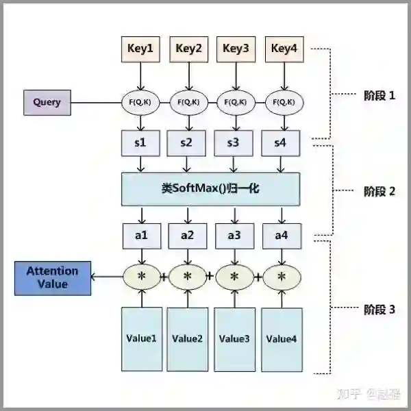 从上面的建模,我们可以大致感受到 Attention 的思路简单,四个字“带权求和”就可以高度概括,大道至简。做个不太恰当的类比,人类学习一门新语言基本经历四个阶段:死记硬背(通过阅读背诵学习语法练习语感)->提纲挈领(简单对话靠听懂句子中的关键词汇准确理解核心意思)->融会贯通(复杂对话懂得上下文指代、语言背后的联系,具备了举一反三的学习能力)->登峰造极(沉浸地大量练习)。