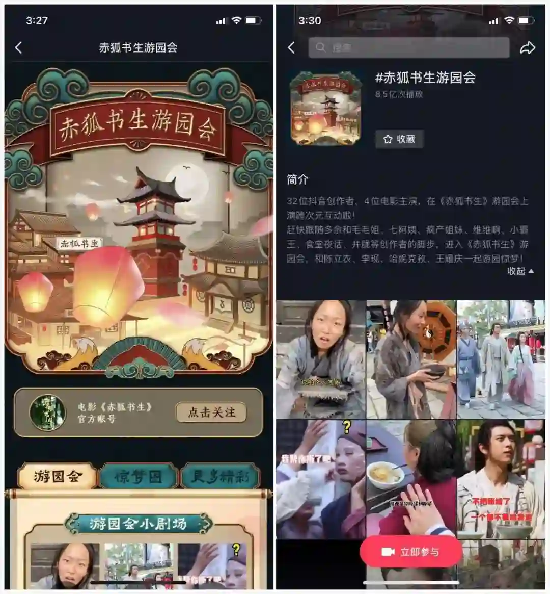 在抖音上搜索“赤狐书生”,能得到一个专属界面。抖音为电影设计了一个名为“赤狐书生游园会”的活动,在“游园会小剧场”中,可以看到 32 位抖音头部创作者(包括毛毛姐、七阿姨、疯产姐妹、维维啊、小霸王、食堂夜话、井胧等)与 4 位电影主演(陈立农、李现、哈尼克孜、王耀庆)在《赤狐书生》片场互动拍摄的抖音风格小短片。