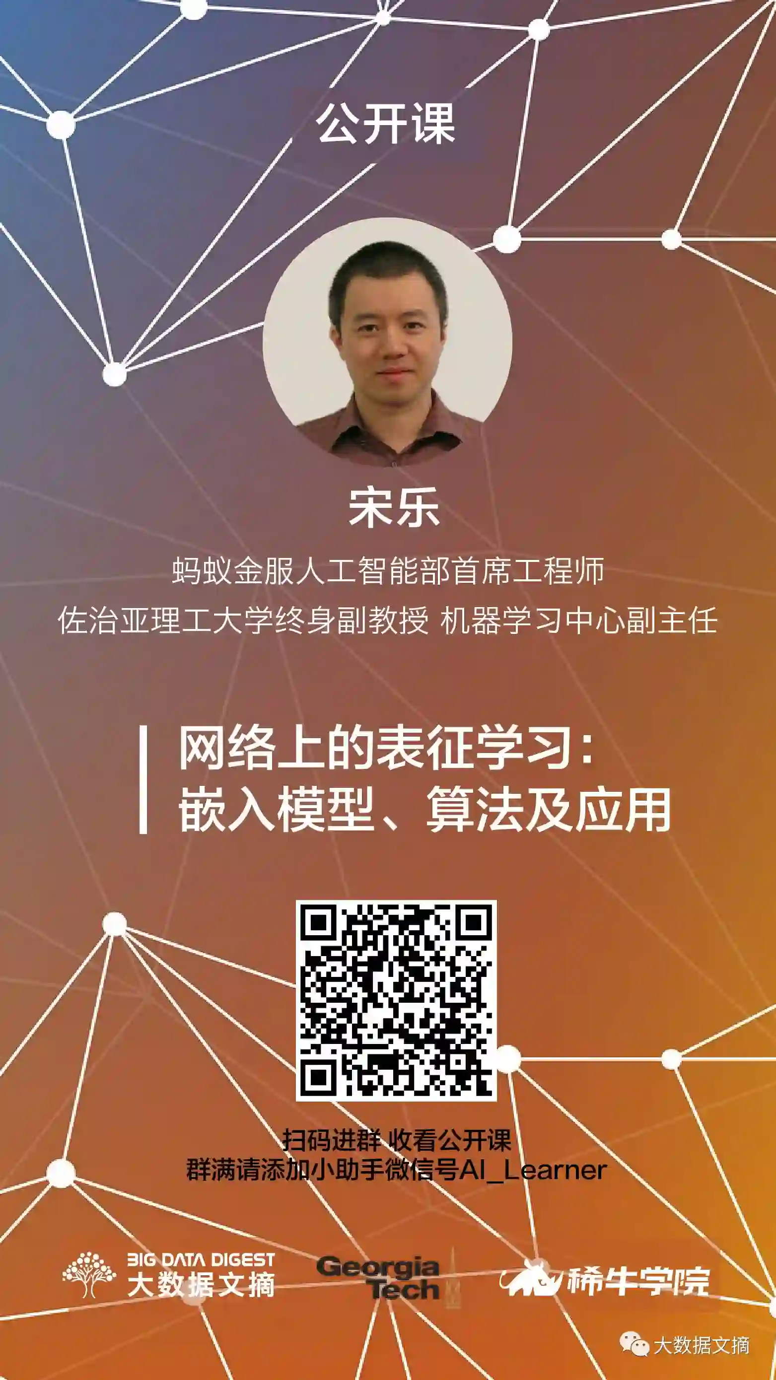 宋乐(Le Song)是蚂蚁金服人工智能部的首席工程师(Principle Engineer),同时也是佐治亚理工大学计算科学与工程系终身副教授,机器学习中心副主任。他于2008年在Alex Smola的指导下从悉尼大学和NICTA获得机器学习博士学位。2008年至2011年间,在卡内基梅隆大学机器学习系Eric Xing和Carlos Guestrin的指导下进行了博士后研究。在2011年加入佐治亚理工学院之前,他曾是一名Google的科学家。