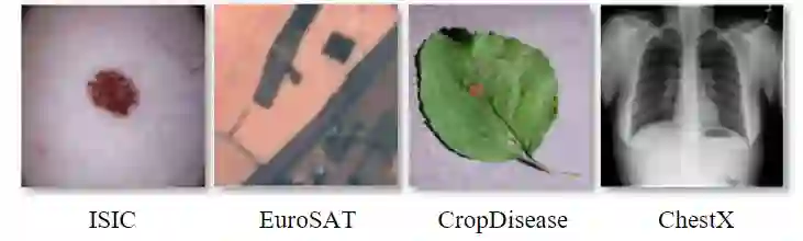 Few-Shot跨域分类能够衡量算法适应下游目标任务的能力。测试使用的基准数据包括:CropDisease (植物叶片图像,14种以上植物的38种疾病状态)、EuroSAT(RGB卫星图像,10类)、ISIC 2018(皮肤病变的DER-MOSCOPIC图像,7种疾病状态)和ChestX (胸部X射线,16种情况)。