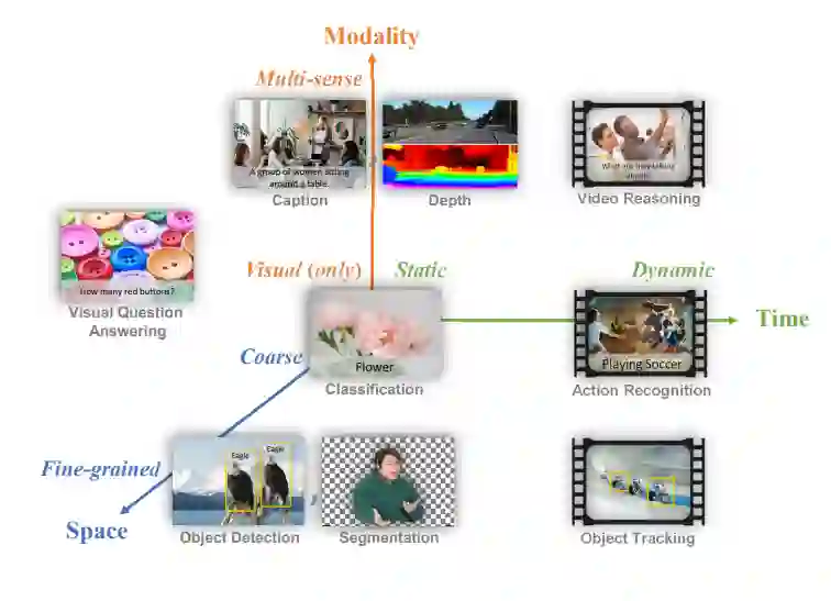 常见的计算机视觉任务被映射到时空模态空间。计算机视觉基础模型应该成为能够胜任所有这些任务的通用视觉系统。