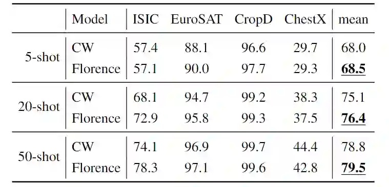 评估包括5-shot、20-shot和50-shot的5-way分类。为了预测类别,研究人员将一个单层线性层作为CoSwin图像编码器的adapter head。