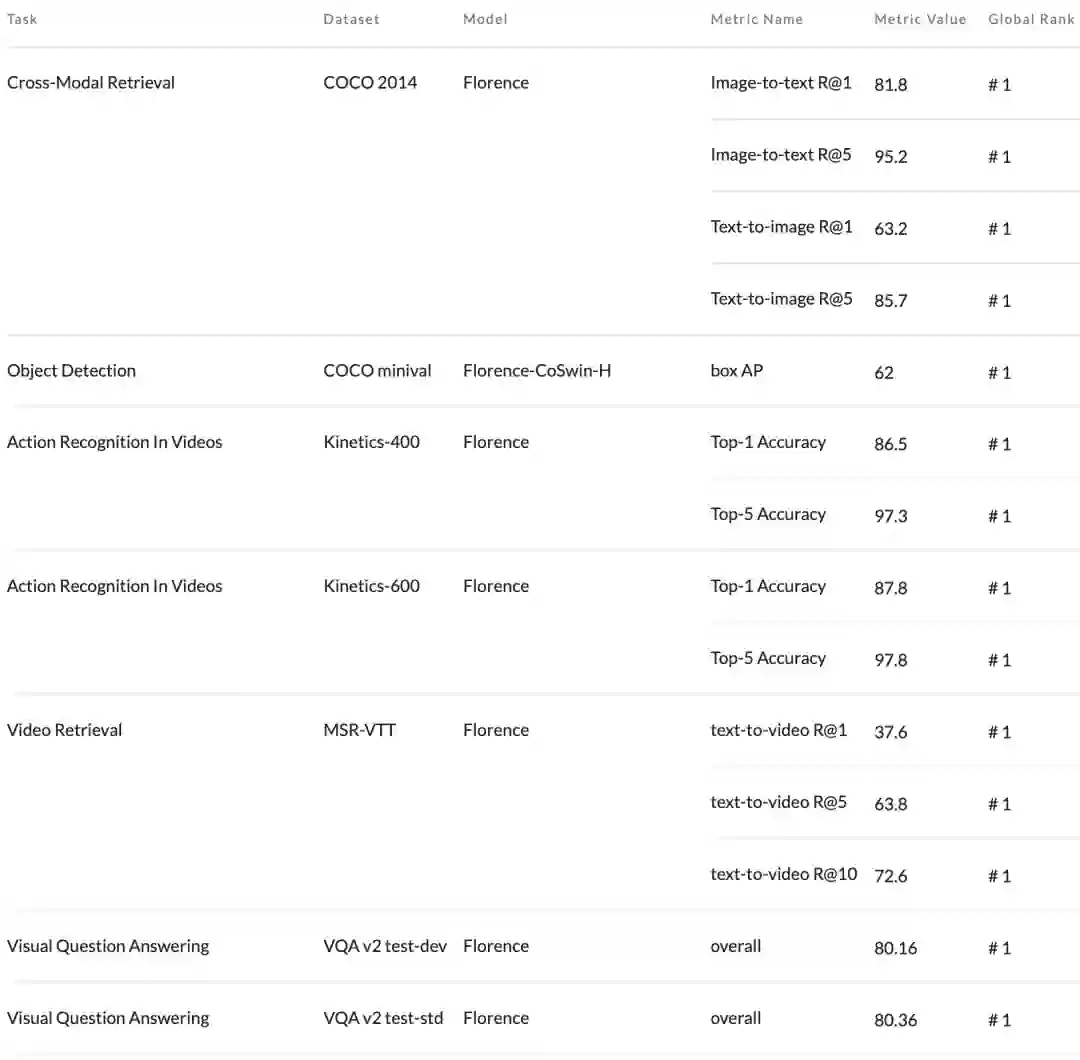 Florence在44个代表性基准中的大多数基准中实现了新的SOTA结果,例如ImageNet-1K zero-shot分类的Top-1准确率为83.74,Top-5准确率为97.18,COCO上微调可实现62 mAP,VQA上达到80.36,Kinetics-600上达到87.8。