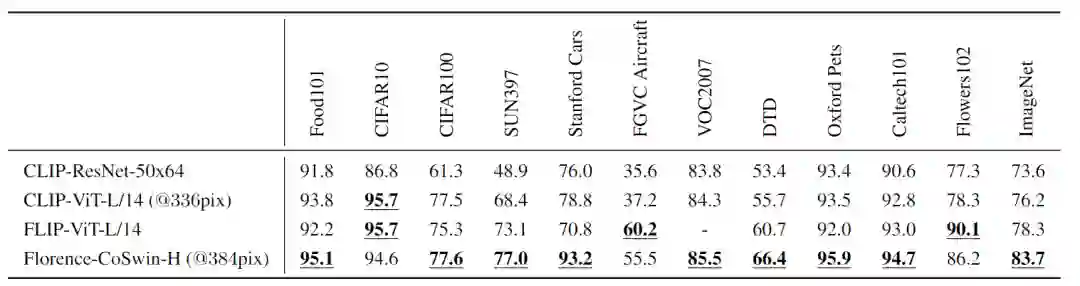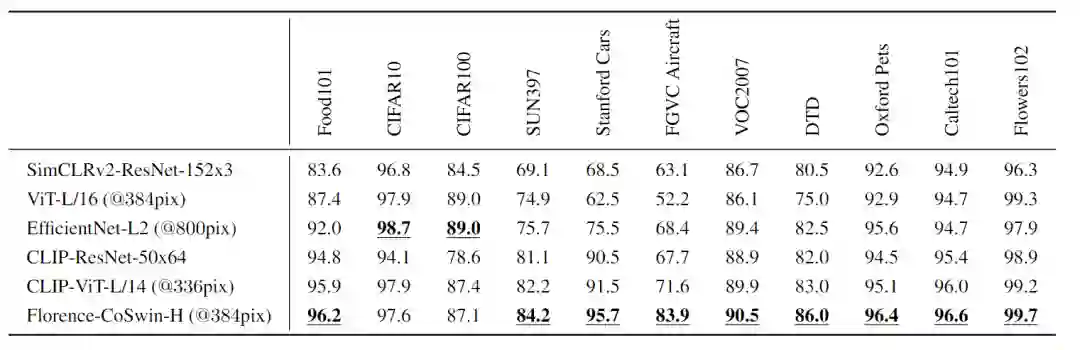 实验部分遵循CLIP的设置,对于每个数据集,使用数据集中所有类的名称作为潜在文本对集,并使用Florence预测的最可能的「图像、文本」对。