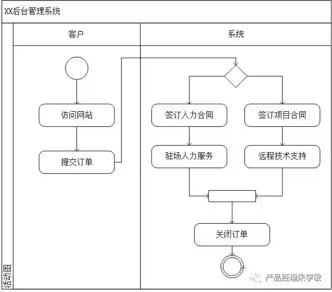 以某业务系统为例,客户完成项目外包的这一活动过程中,分别是用户下单,选择服务,提供服务这三方面完成流程的转换,其实就是侧重从行为的动作描述。
