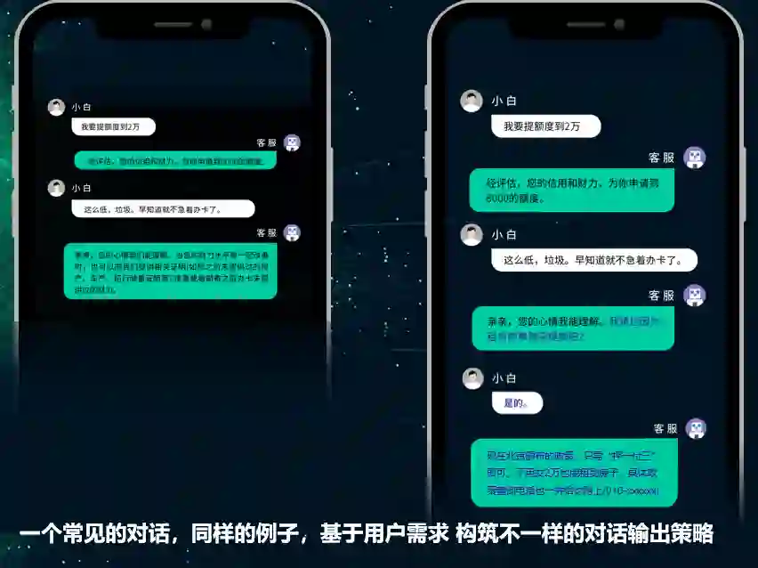 说到这里,刘杰举了一个例子。假如有位客户向银行提出了信用卡「提额」的请求,但根据系统规则,这一需求没办法得到满足。此时,传统的智能客服可能会直接给出拒绝的回答,履行最浅显的职责。但实际上,这种简单粗暴的做法说明模型只是具备了最基本的理解能力,但共情、表达和策略选择方面都有所欠缺,因此给客户带来的体验是很差的。