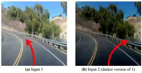 图 1:由 DeepXplore 找到的 Nvidia DAVE-2 自动驾驶汽车平台上一个错误行为的示例。图 a:这个基于 DNN 的自动驾驶汽车正确决定左转;图 b:相反,这辆车决定右转撞向护栏。b 图的场景比 a 的更加灰暗。