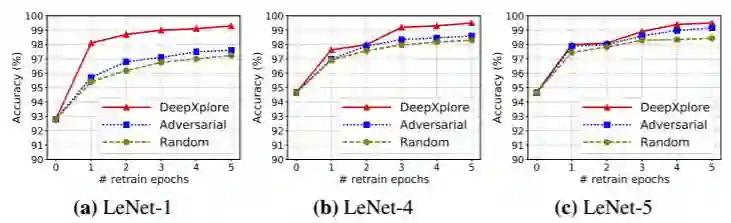 图 9:当训练数据集使用了同样数量的输入(分别通过随机选择、对抗测试和 DeepXplore 生成)进行增强时,三种 LeNet DNN 的准确度的提升