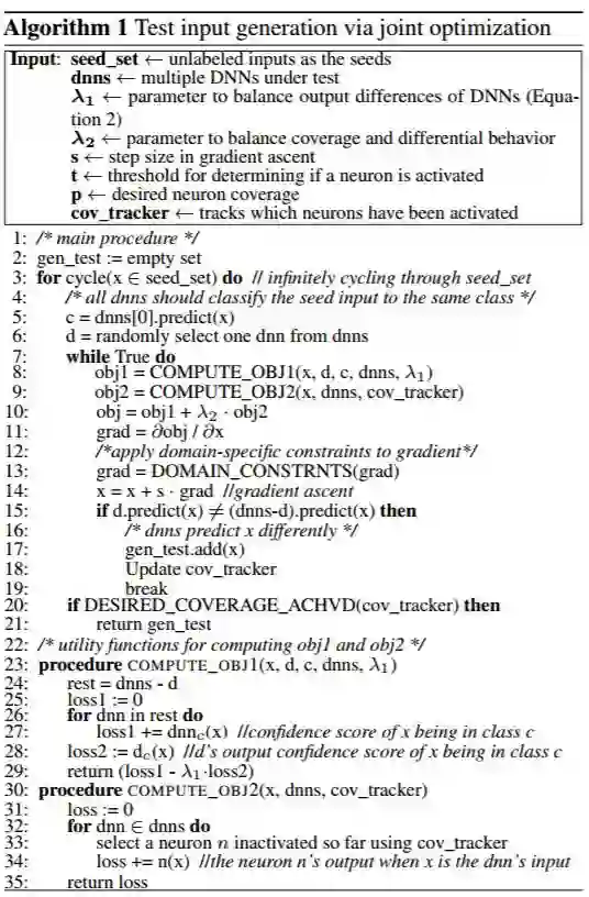 我们给出了寻找相似深度学习系统之间的大量行为差异的问题,同时最大化神经元覆盖率可以被阐释为一个联合优化问题。我们提出了一种基于梯度的算法来有效地解决这种问题。