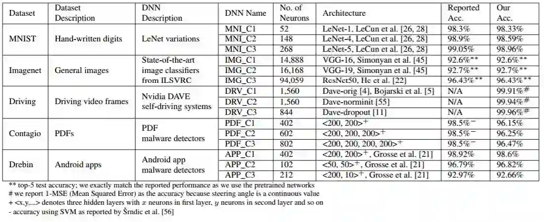 表 1:用于评估 DeepXplore 的 DNN 和数据集的细节