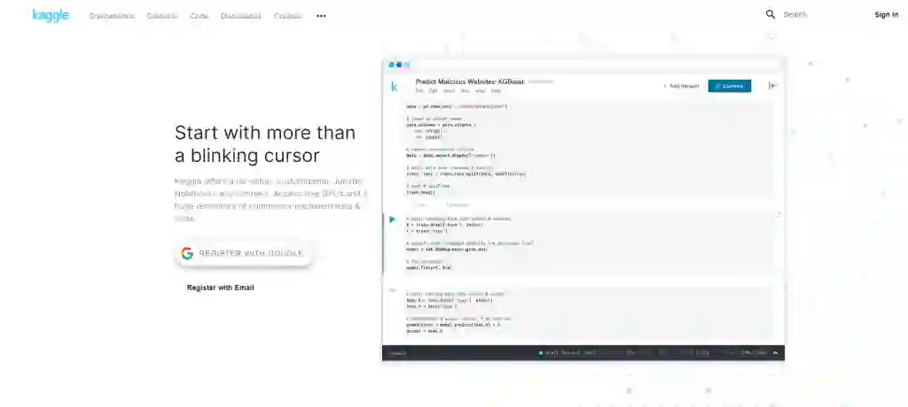 那么,我们哪里可以找到高质量的数据集?这里推荐几个网站,首先是 Kaggle:在 Kaggle 中,你会找到进行数据科学工作所需的所有代码和数据,Kaggle 拥有超过 50,000 个公共数据集和 400,000 个公共 notebook,可以快速完成任务。