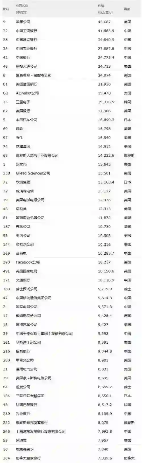 2017年《财富》世界500强排行榜出炉,其中利润榜的前五名除了排在第一位的苹果公司,其余均为中国的商业银行——工商银行、建设银行、农业银行和中国银行。今年值得一提的是:随着阿里巴巴、腾讯上榜,加上去年首次上榜的京东,全球6家互联网服务大公司中国和美国各占一半。美国的三家为亚马逊、谷歌母公司Alphabet,以及今年新上榜的社交媒体巨头Facebook。