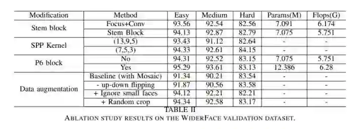 另外由于YOLO5Face采用 Stem 块结构取代 YOLOv5 的 Focus 层,作者认为这样增加了网络的泛化能力,并降低了计算的复杂性。对于替换Focus层带来精度的提升,论文也给出了一些消融实验的对比,还是提了一些点。另外就是,去掉Focus的骚操作后,C++工程的难度也降低了一些,起码在用NCNN的时候,不用再额外捏个YoloV5FocusLayer自定义层进去了。