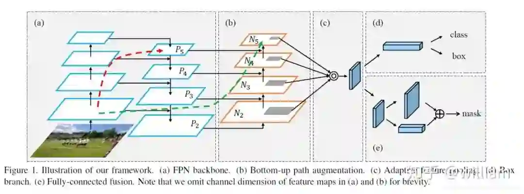 PANET基于 Mask R-CNN 和 FPN 框架,同时加强了信息传播。该网络的特征提取器采用了一种新的增强自下向上路径的 FPN 结构,改善了低层特征的传播。第三条通路的每个阶段都将前一阶段的特征映射作为输入,并用3x3卷积层处理它们。输出通过横向连接被添加到自上而下通路的同一阶段特征图中,这些特征图为下一阶段提供信息。同时使用自适应特征池化(Adaptive feature pooling)恢复每个候选区域和所有特征层次之间被破坏的信息路径,聚合每个特征层次上的每个候选区域,避免被任意分配。