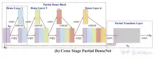CSPNet实际上是基于Densnet的思想,复制基础层的特征映射图,通过dense block 发送副本到下一个阶段,从而将基础层的特征映射图分离出来。这样可以有效缓解梯度消失问题(通过非常深的网络很难去反推丢失信号) ,支持特征传播,鼓励网络重用特征,从而减少网络参数数量。