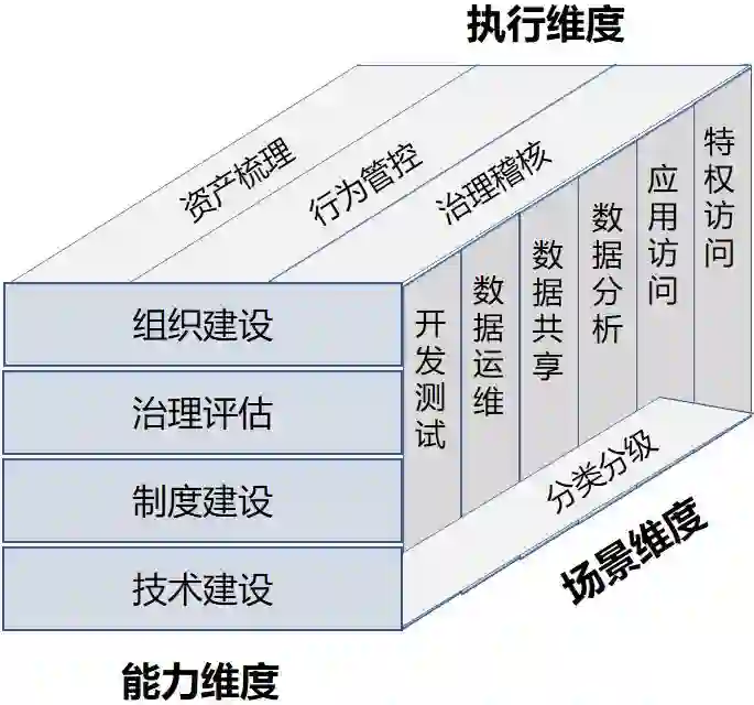 能力维度:完善的组织机构、有针对性和可行的管理制度和规范、全面和先进的数据安全技术,是构建数据安全治理体系的基础。