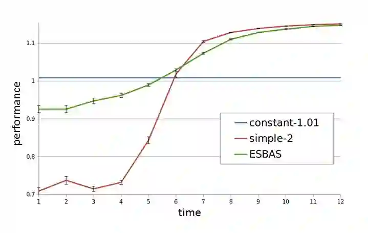 微软的研究人员们在谈判对话博弈场景中进行了实验。测试使用的算法选择系统 ESBAS 中含有两个算法,每个算法单独的表现如下图,一个很稳定(蓝线),另一个最初很差,会逐渐学习并改善(红线)。ESBAS 的表现是绿色的线,它在每一时刻的表现都更接近更好的那个算法。